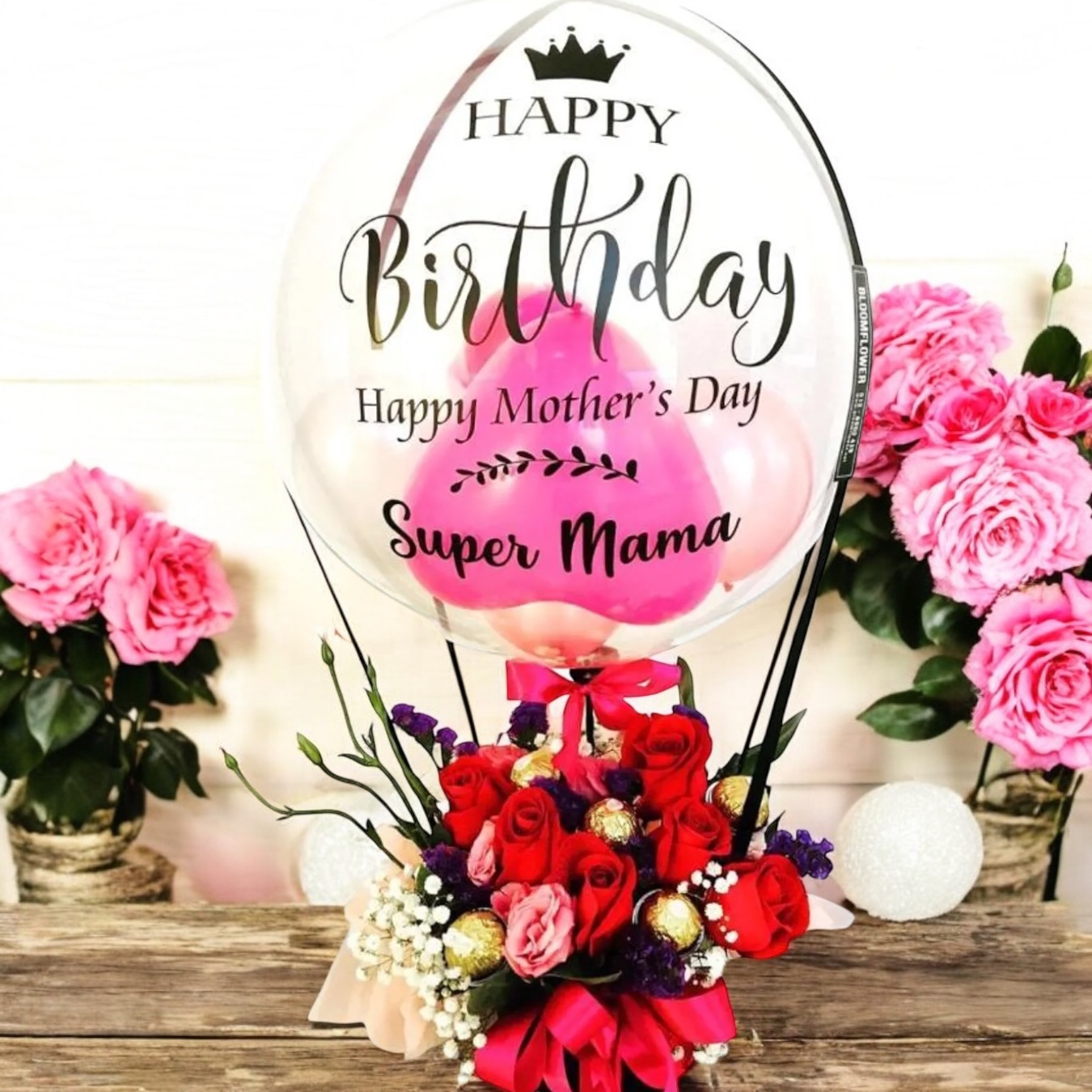 Happy Birthday & Happy Mother's Day Hot Air Balloon 6 Roses + 6 Ferrero Rocher Bouquet